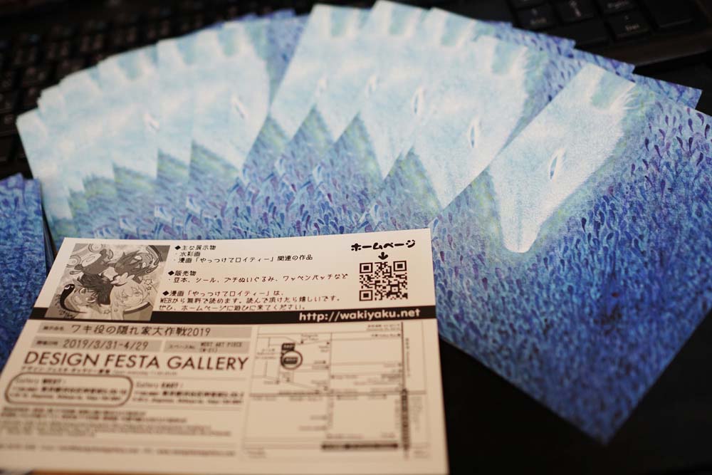 ◆印刷会社:プリントパック ◆片面フルカラー、裏単色、ポストカードサイズ 表はあえて何も文字を入れずに、通りすがりに何となく持って帰った人が家で絵だけでも楽しめるようにしました。 裏には展示情報などをつめこんでます。